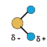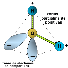 presenta una distribución asimétrica de sus electrones, lo que la convierte en una molécula polar, alrededor del oxígeno se concentra una densidad de carga negativa , mientras que los núcleos de hidrógeno quedan desnudos, desprovistos parcialmente de sus
