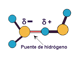 Así se establecen interacciones dipolo-dipolo entre las propias moléculas de agua, formándose enlaces o puentes de hidrógeno, la carga parcial negativa del oxígeno de una molécula ejerce atracción electrostática sobre las
