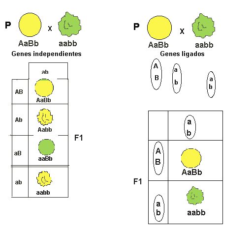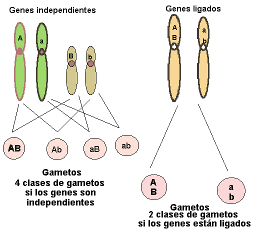 Como se aprecia en el esquema los dos caracteres elegidos por Mendel color de la semilla "A" y forma de la semilla "B" se encuentran en distintos cromosomas y por lo tanto el individuo dihíbrido AaBb formará cuatro clase de gametos (AB, Ab, aB, ab ). En cambio si los genes que estamos estudiando se encuentran localizados en el mismo cromosoma
