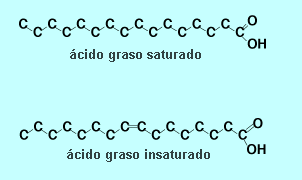 • Los ácidos grasos insaturados tienen uno o varios enlaces dobles en su cadena y sus moléculas presentan codos, con cambios de dirección en los lugares dónde aparece un doble enlace. Son ejemplos el oléico (18C, un doble enlace) y el linoleíco (18C y dos dobles enlaces).