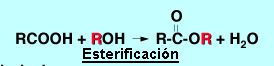• Esterificación. Un ácido graso se une a un alcohol mediante un enlace covalente, formando un éster y liberándose una molécula de agua.