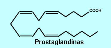 Las prostaglandinas son lípidos cuya molécula básica está constituída por 20 átomos de carbono que forman un anillo ciclopentano y dos cadenas alifáticas.