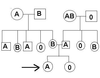 La persona señalada con una flecha se casa con un hombre que tiene un grupo sanguíneoo AB. Determine qué grupos sanguíneos pueden tener sus hijos, así como la probabilidad de cada uno de ellos.